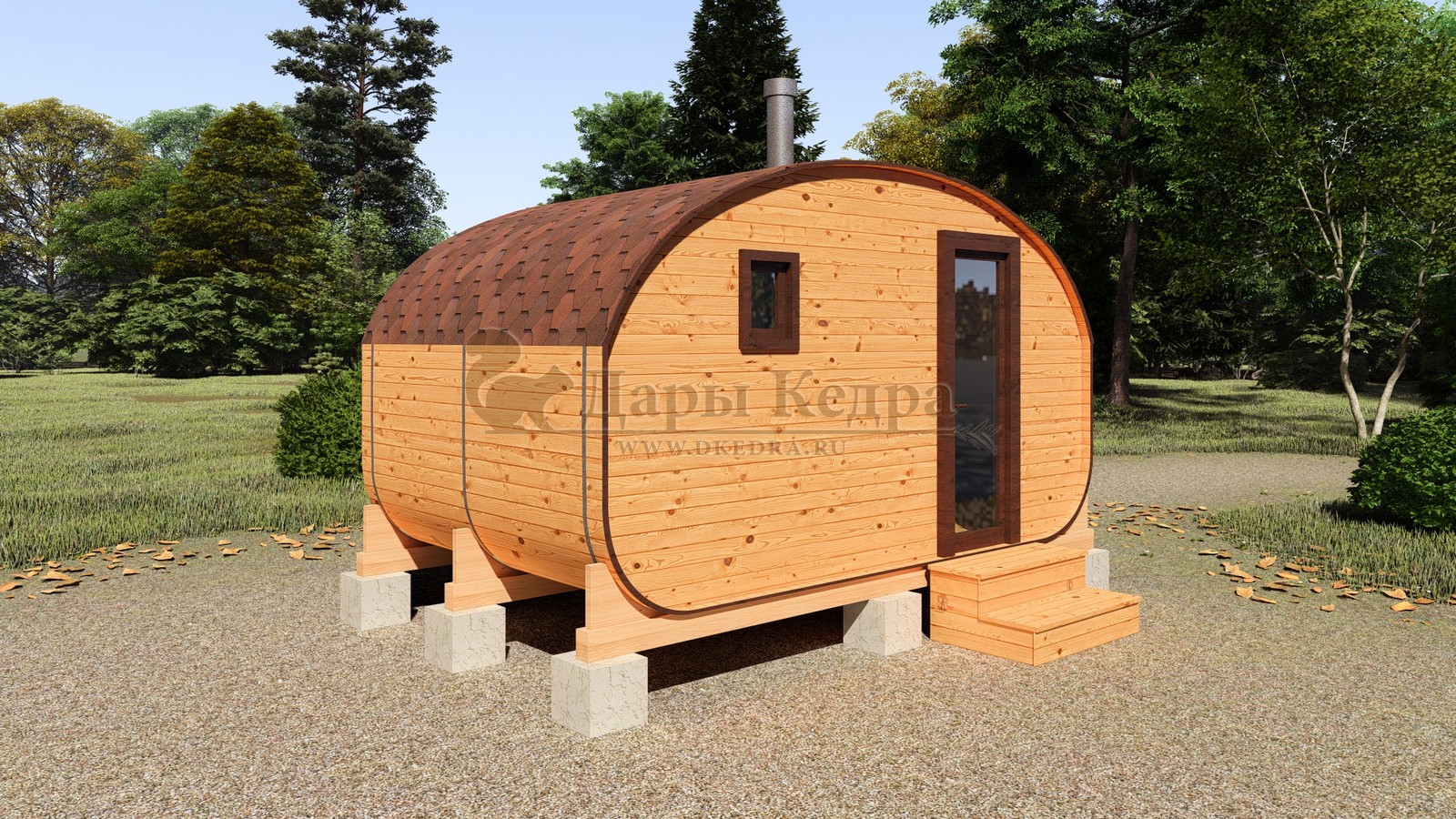 Баня-бочка буханка из кедра 3 метра Это более просторная модель за счет увеличенной высоты потолков и ровного пола. В такой модели раздевалка совмещена с моечной. Тут установлен душевой поддон, вешалка, полочка и лавочка из кедра. В парильном отделении по обе стороны расположены двухуровневые открытые полки, печь находится между ними у дальней стены. Время растопки такой бани не превышает 30 минут. По вашему желанию баню-бочку можно укомплектовать козырьком, верандой и печью с внешней загрузкой, благодаря которой весь мусор во время топки остается на улице. Баня-бочка буханка не требует полноценный фундамент, поэтому при необходимости ее можно перенести в другое место. Обращаем Ваше внимание, что в стандартную комплектацию бани входят полки открытого типа в парной с обеих сторон. Дополнительно можно заказать полок закрытого типа или лавку! Кедр обладает ароматическими свойствами. Он не деформируется и влагоустойчив, при правильном уходе за деревом на нем не развиваются грибки и плесень.