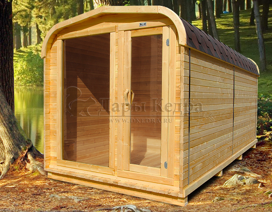 Баня-бочка овальная из кедра 5х2,2 метра Овальная баня-бочка из кедра просторная и вместительная. Имеет два отделения: раздевалку, которую можно использовать как комнату отдыха, и парилку. Для удобства пользования раздевалка оснащена лавочкой, полкой и вешалкой из кедра. В парильном отделении располагается печь и двухуровневый открытый полок. Для установки такой модели не требуется полноценный фундамент, поэтому при необходимости ее можно перенести на другое место. Так же баню-бочку можно укомплектовать верандой со скамейками, козырьком и печью с внешней загрузкой, благодаря которой весь мусор после топки останется на улице. Древесина кедра насыщена эфирными маслами и фитонцидами, которые активируются при воздействии температур. Таким образом, парение в каркаско-щитовых банях из кедра вдвойне полезно.