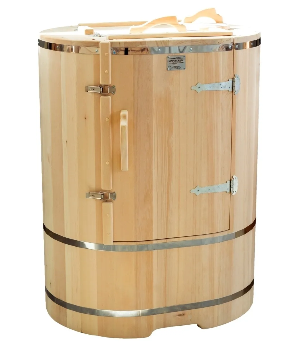 Кедровая бочка (фитобочка) круглая «Классическая» Круглая фитобочка из кедра - это мини парная, которую можно использовать не только в спа-салонах, но и дома. Такая модель наиболее компактна и мобильна. Толщина стенок составляет 25 мм. Фитобочка оборудована откидными створками, дверцей и отверстием для головы. Во время парения человек сидит внутри кедровой бочки, а голова находится снаружи. Благодаря этому исключается возможность перегрева. Подлокотники из кедра, встроенные ручки на створках и двери делают эксплуатацию более удобной. Парение в фитобочке благотворно влияет на организм в целом: повышается иммунитет, выводятся шлаки и токсины, улучшается работа органов тела и состояние кожи.