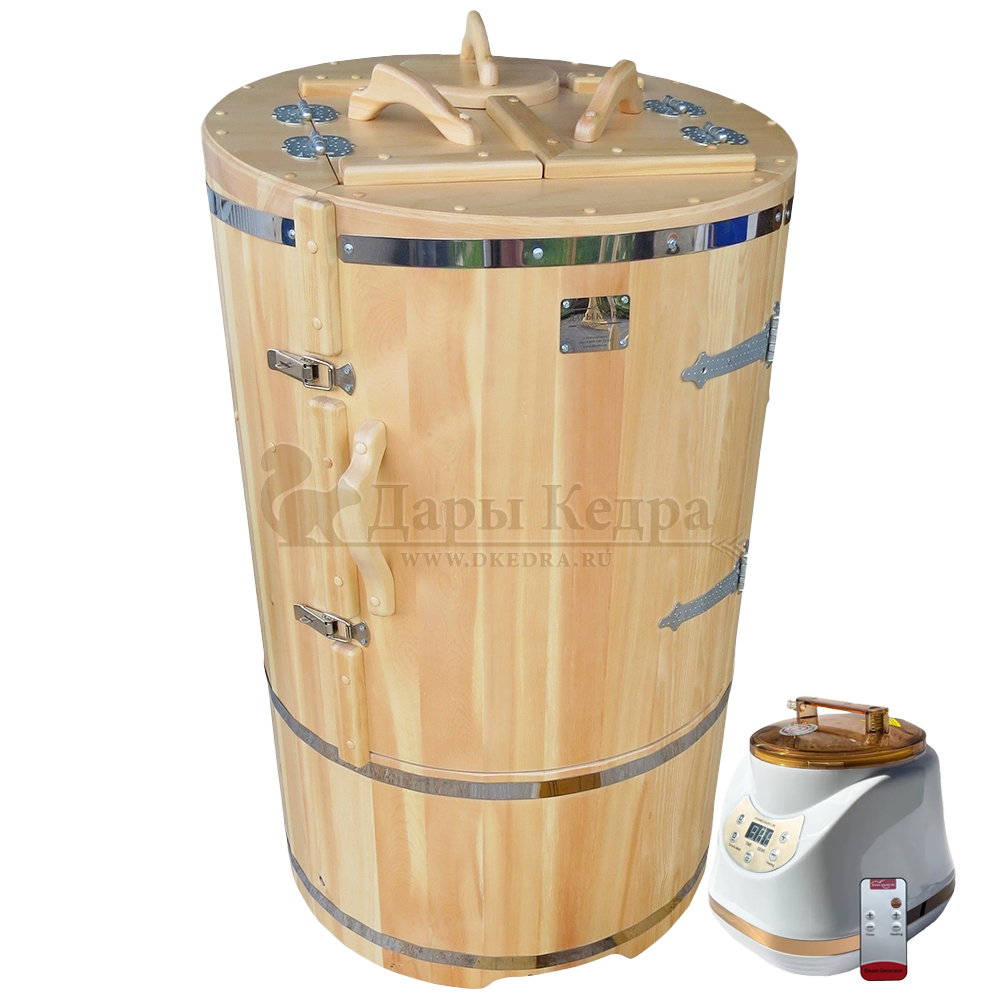 Готовый комплект «Домашний»: кедровая бочка с парогенератором + био-защита изнутри и снаружи Готовый комплект - это полностью укомплектованный набор с фитобочкой для процедур парения. Круглая модель наиболее компактна и мобильна. Толщина стенок составляет 25 мм. Фитобочка оборудована откидными створками, дверцей и отверстием для головы. Верхний скос изделия делает положение головы более комфортным и улучшает обзор. Во время парения человек сидит внутри кедровой бочки, а голова находится снаружи. Благодаря этому исключается возможность перегрева. Подлокотники из кедра, встроенные ручки на створках и двери делают эксплуатацию более удобной. Парение в фитобочке благотворно влияет на организм в целом: повышается иммунитет, выводятся шлаки и токсины, улучшается работа органов тела и состояние кожи.