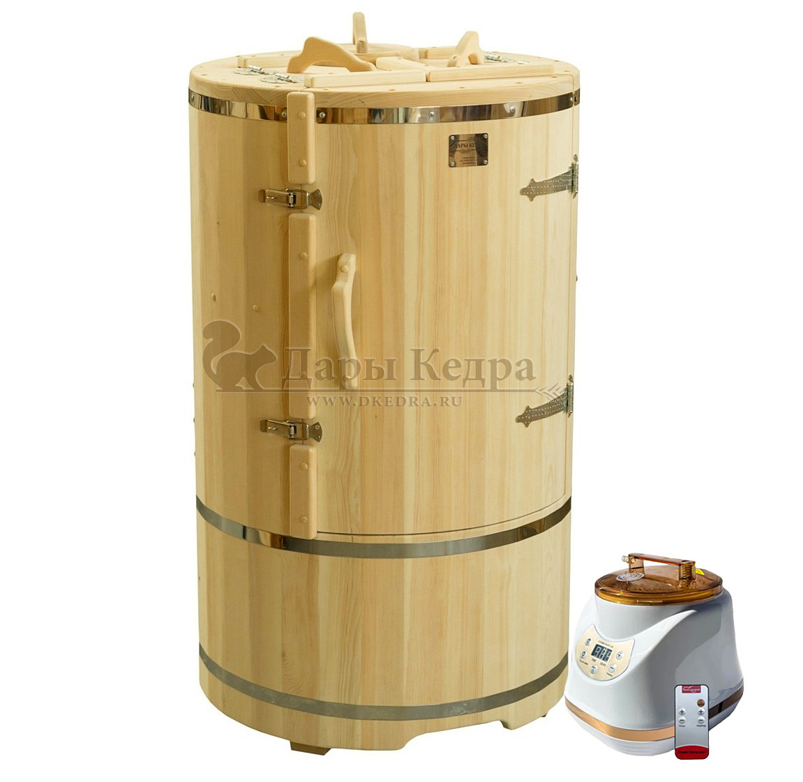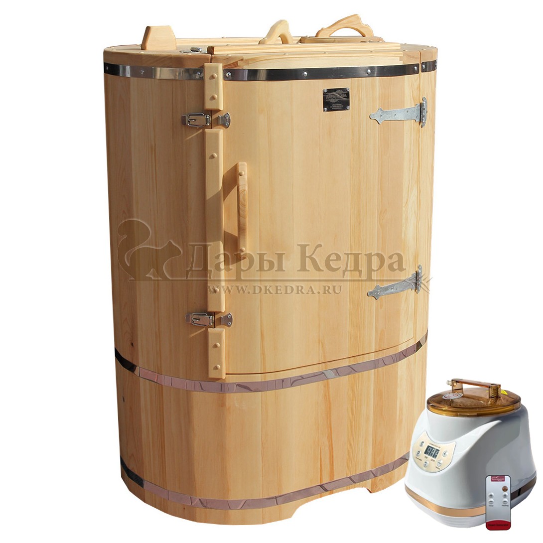 Готовый комплект «Универсальный»: кедровая бочка с парогенератором + био-защита изнутри и снаружи Готовый комплект - это полностью укомплектованный набор с фитобочкой для процедур парения. Овальная модель более просторна и удобна в использовании. Толщина стенок составляет 40-45 мм, что позволяет увеличить срок службы изделия. Верхний скос делает положение головы более комфортным и улучшает обзор. Фитобочка оборудована откидными створками, дверцей и отверстием для головы. Во время парения человек сидит внутри кедровой бочки, а голова находится снаружи. Благодаря этому исключается возможность перегрева. Подлокотники из кедра, встроенные ручки на створках и двери делают эксплуатацию более удобной. Парение в фитобочке благотворно влияет на организм в целом: повышается иммунитет, выводятся шлаки и токсины, улучшается работа органов тела и состояние кожи.
