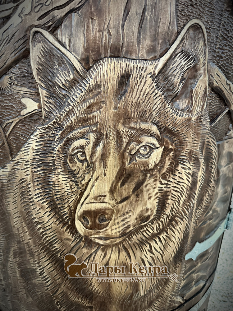Кедровая бочка (фитобочка) «Сибирский волк» Любая модель эксклюзивной фитобочки - это выбор не только дизайнеров и ценителей красоты, но и тех, кто любит нестандартный подход в любых деталях. С оригинальной авторской фитобочкой Дары Кедра ваша квартира, дом или салон красоты станут объектом всеобщего внимания, ведь такая фитобочка - это не просто смело, красиво и достойно, это еще и очень полезно для Вашего здоровья! Художественная резьба это ручная работа, выполняется разными мастерами и каждый рисунок неповторим. Вы можете выбрать предложенные варианты резьбы или подобрать изображение и мы предложим вам подходящий эскиз. На сайте представлены наши работы в качестве примера. Каждая резьба рассчитывается индивидуально и может быть нанесена на любую модель фитобочки. Эксклюзивная фитобочка может быть представлена в разной цветовой гамме: После того, как цвет фитобочки выбран, необходимо определиться с вариантом резьбы (или предложить свой): Фитобочку можно также декорировать канатной веревкой в места обручей из нержавеющей стали (оплачивается дополнительно).